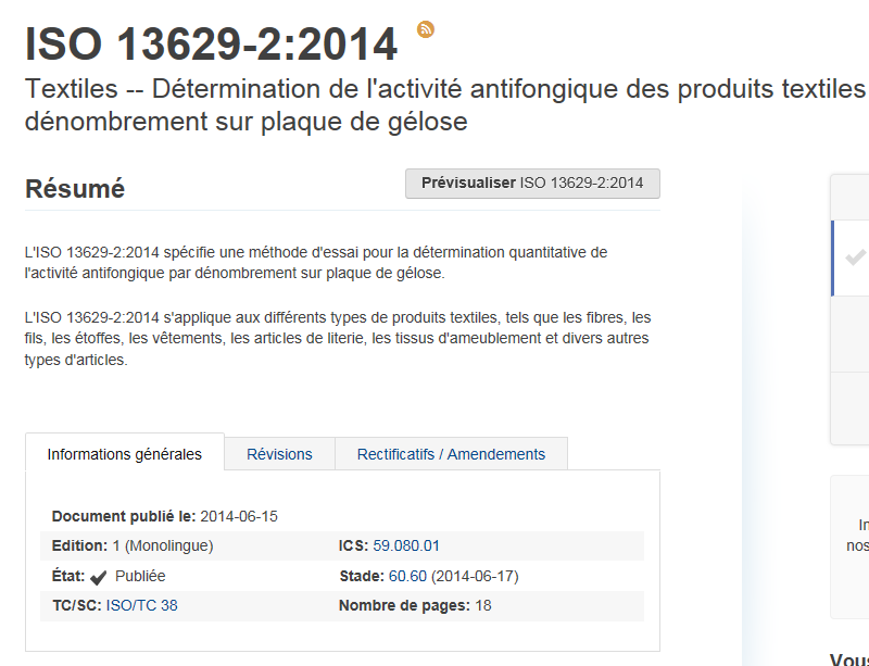 2014年9月19日,ISO正式发布《纺织品抗真菌性能测试 第2部分 平板法》(ISO 13629-2:2014)。标准规定了用平板计数法测试纺织品抗真菌